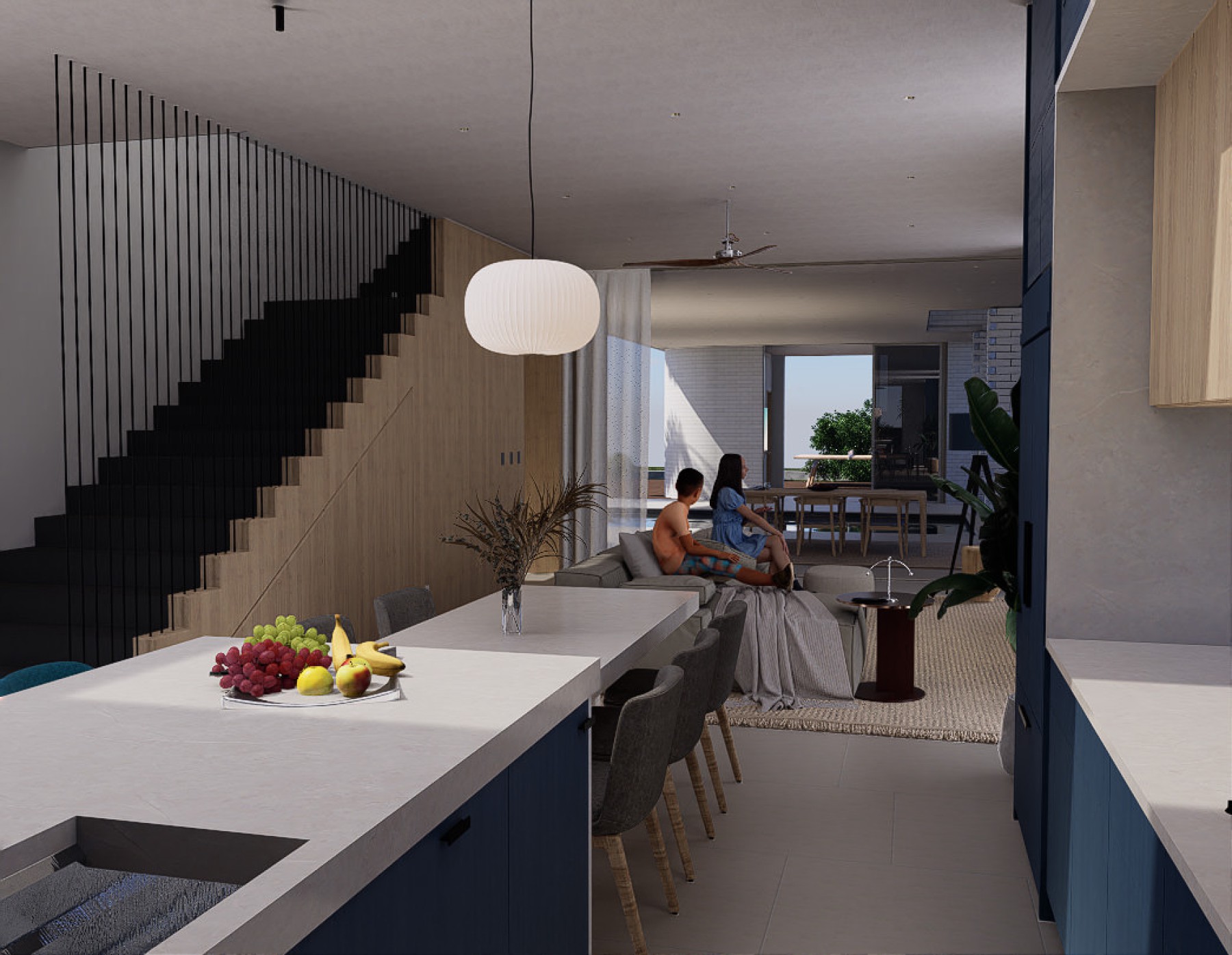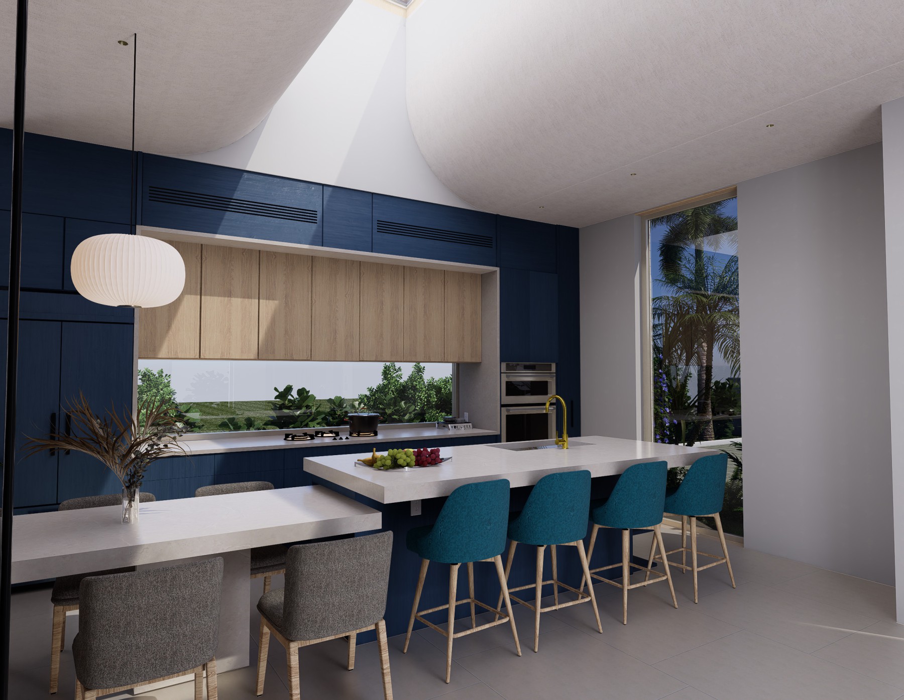 Drawing inspiration from the historical architecture of Turks and Caicos, we chose white limestone brick to enrich the villa's textural appeal. The elegant front facade, designed as a single-story structure, features a skylight above the kitchen, reducing the visual impact of the building and enhancing the villa's welcoming approach.